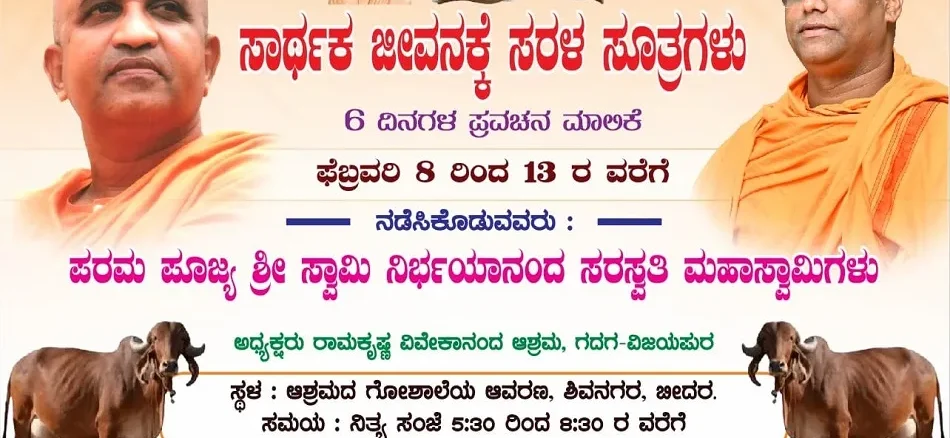 The Ramakrishna Vivekananda Ashrama, Shivanagar, Bidar, is organizing a six-day spiritual discourse series titled “Sādhaka Jīvanakke Sarala Sutragaḷu” (Simple Principles for a Devotee’s Life). This inspiring program will run from February 8th to 13th, 2025, guiding devotees on how to lead a meaningful, balanced, and spiritually enriched life.