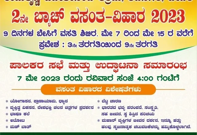 The Ramakrishna Vivekananda Ashrama, Shivanagar, Bidar, is organizing the 2nd Batch of Vasantha Vihara 2023, a special nine-day spiritual summer retreat for students, devotees, and seekers. This divine event will be held from 7th May to 15th May 2023, offering a unique blend of spiritual guidance, cultural exposure, and moral education.